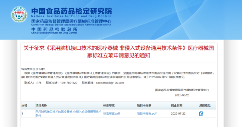 6月23日,國家藥監(jiān)局醫(yī)療器械標(biāo)管中心發(fā)布《采用腦機(jī)接口技術(shù)的醫(yī)療器械 非侵入式設(shè)備通用技術(shù)條件》醫(yī)療器械國家標(biāo)準(zhǔn)立項申請,同時隨附了標(biāo)準(zhǔn)草案,并向社會公開征求意見。