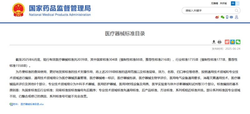 近日,國家藥監(jiān)局發(fā)布《醫(yī)療器械標準目錄》,其中提到,截至2025年6月24日,現(xiàn)行有效醫(yī)療器械標準共2039項,其中國家標準304項(強制性標準88項,推薦性標準216項),行業(yè)標準1735項(強制性標準177項,推薦性標準1558項)。