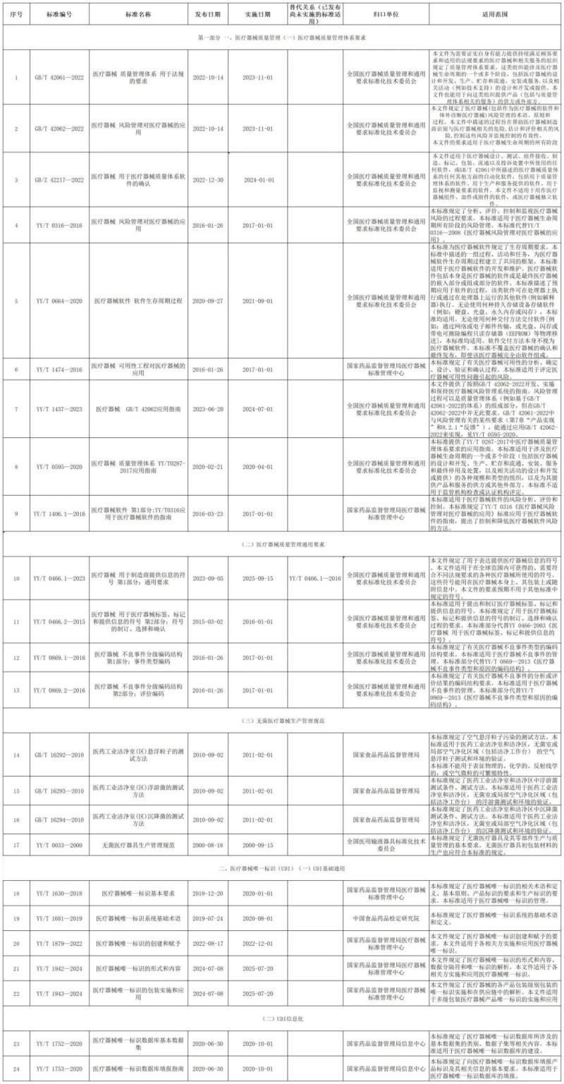 國家藥監(jiān)局將上述2039項標準的適用范圍以及標準層級、效力、名稱、歸口單位等信息,按照通用技術(shù)領(lǐng)域和專業(yè)技術(shù)領(lǐng)域進行編排,通用技術(shù)領(lǐng)域細分為醫(yī)療器械質(zhì)量管理、醫(yī)療器械唯一標識、醫(yī)療器械包裝、醫(yī)療器械生物學評價、醫(yī)用電氣設(shè)備通用要求、消毒滅菌通用技術(shù)、醫(yī)療器械臨床評價及其他8個部分,專業(yè)技術(shù)領(lǐng)域細分為外科手術(shù)器械、醫(yī)用防護器械、醫(yī)用X射線設(shè)備及用具、醫(yī)學實驗室與體外診斷器械和試劑等33個部分。我們對該標準目錄部分展示如下: