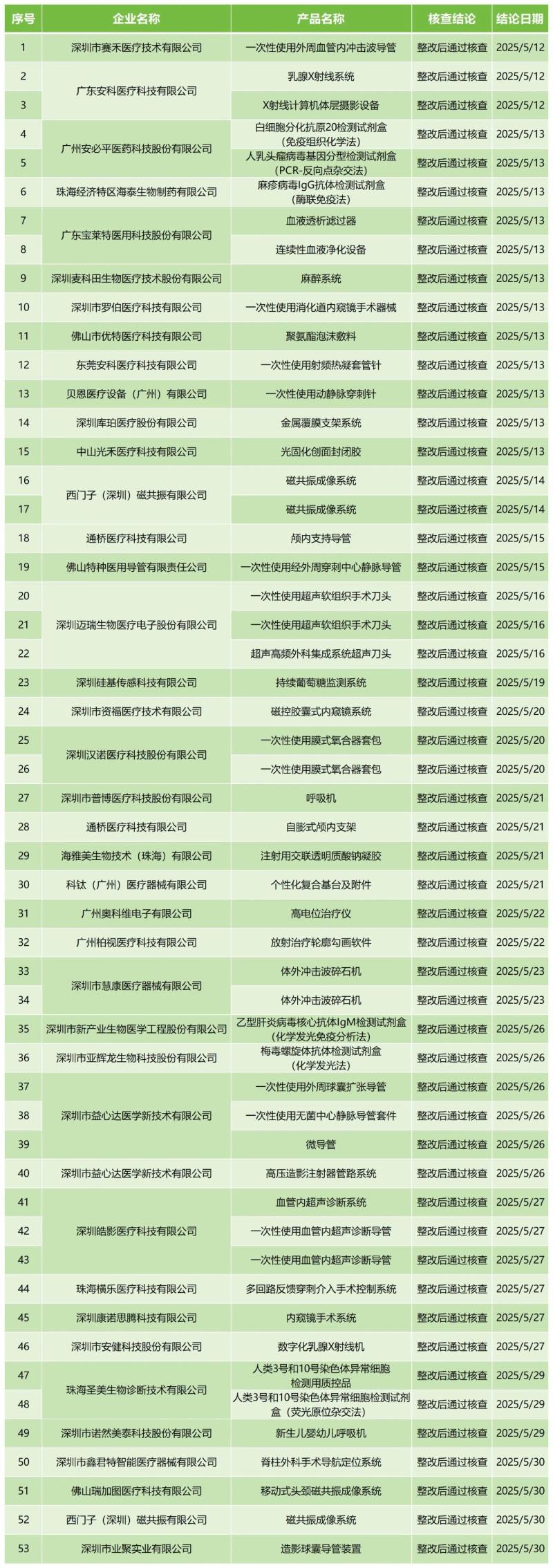6月27日,廣東省藥監(jiān)局官網(wǎng)公布2025年5月醫(yī)療器械注冊質量管理體系核查結果,包括深圳硅基傳感科技有限公司的持續(xù)葡萄糖監(jiān)測系統(tǒng)、海雅美生物技術(珠海)有限公司的注射用交聯(lián)透明質酸鈉凝膠、廣州奧科維電子有限公司的高電位治療儀、廣州柏視醫(yī)療科技有限公司的放射治療輪廓勾畫軟件等共計53款產(chǎn)品,均為“整改后通過核查”。具體明細見下方表格: