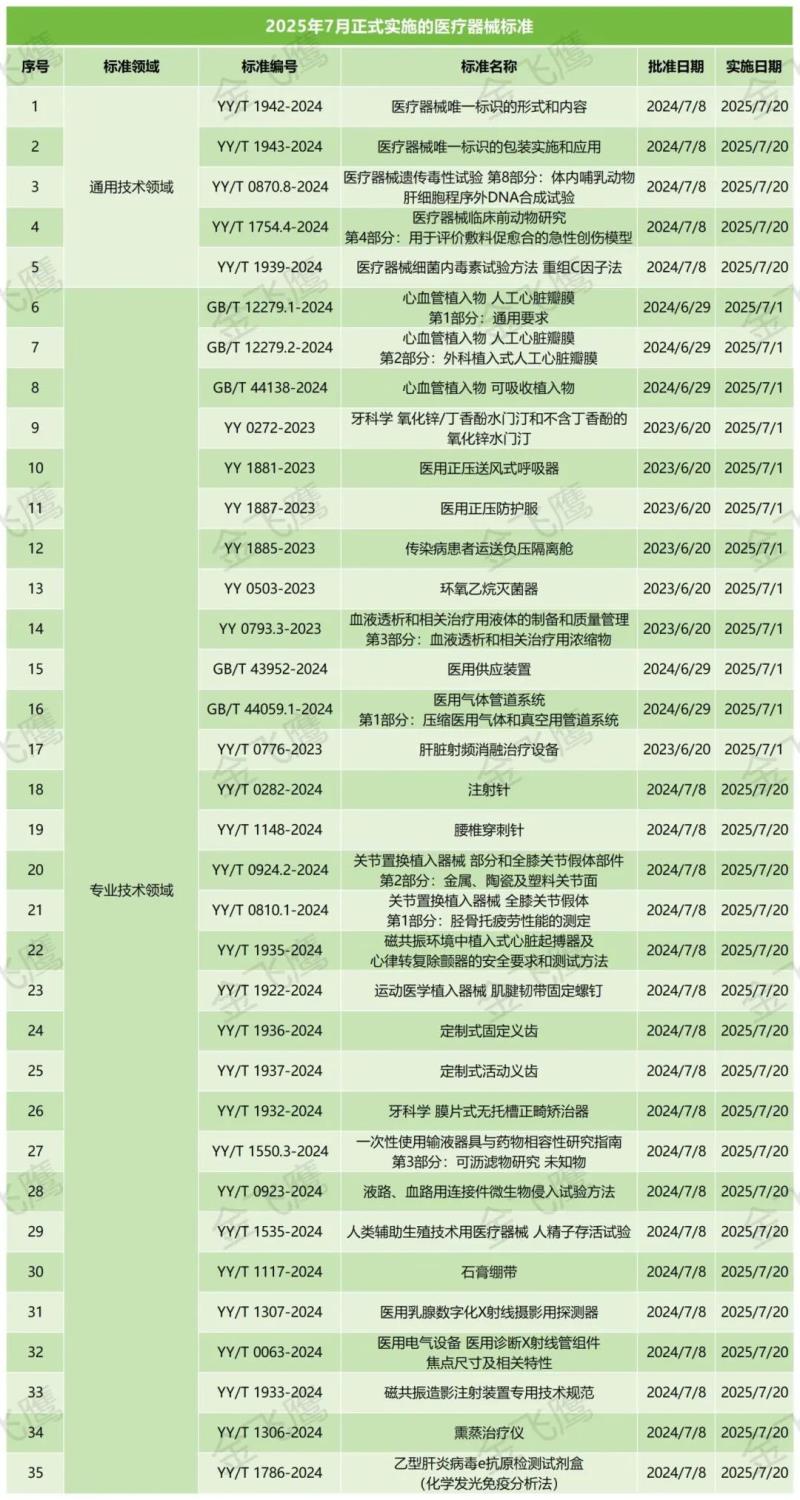 根據(jù)金飛鷹匯總整理,2025年7月起正式實(shí)施的醫(yī)療器械標(biāo)準(zhǔn)共有35項(xiàng),其中已于7月1日實(shí)施的有GB/T 12279.1-2024《心血管植入物 人工心臟瓣膜 第1部分:通用要求》、YY 1887-2023《醫(yī)用正壓防護(hù)服》、YY 0503-2023《環(huán)氧乙烷滅菌器》等共12項(xiàng),即將于7月20日實(shí)施的有YY/T 1942-2024《醫(yī)療器械唯一標(biāo)識(shí)的形式和內(nèi)容》、YY/T 0282-2024《注射針》、YY/T 1936-2024《定制式固定義齒》等共23項(xiàng),具體明細(xì)如下: