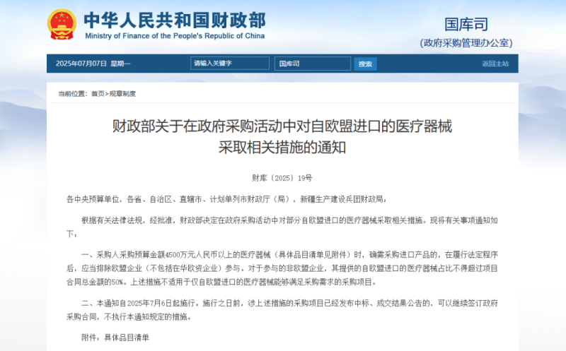 一、采購人采購預算金額4500萬元人民幣以上的醫(yī)療器械(具體品目清單見附件)時,確需采購進口產(chǎn)品的,在履行法定程序后,應(yīng)當排除歐盟企業(yè)(不包括在華歐資企業(yè))參與。對于參與的非歐盟企業(yè),其提供的自歐盟進口的醫(yī)療器械占比不得超過項目合同總金額的50%。上述措施不適用于僅自歐盟進口的醫(yī)療器械能夠滿足采購需求的采購項目。