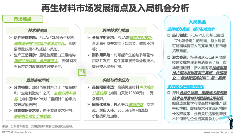 再生材料市場正面臨著技術(shù)壁壘高、醫(yī)生技術(shù)門檻高、監(jiān)管審批嚴(yán)格以及價格與競爭壓力大的多重挑戰(zhàn)。然而,市場痛點背后也蘊藏著入局機會。新入局者可選擇潛力賽道,避開紅海競爭,如羥基磷灰石CaHA憑借其較硬支撐性逐漸被消費者了解,市場增長迅速,新入局者可加速布局,搶占國內(nèi)尚未有三類證的先機,快速建立品牌優(yōu)勢。同時,要關(guān)注技術(shù)的創(chuàng)新與迭代,比如合成生物學(xué)可提高材料的生產(chǎn)效率和性能,緩釋技術(shù)可實現(xiàn)藥物的長效釋放等,深入分析這些創(chuàng)新技術(shù)在再生材料領(lǐng)域的應(yīng)用前景,助力企業(yè)提高競爭力,從而在再生材料市場中尋得發(fā)展新路徑。