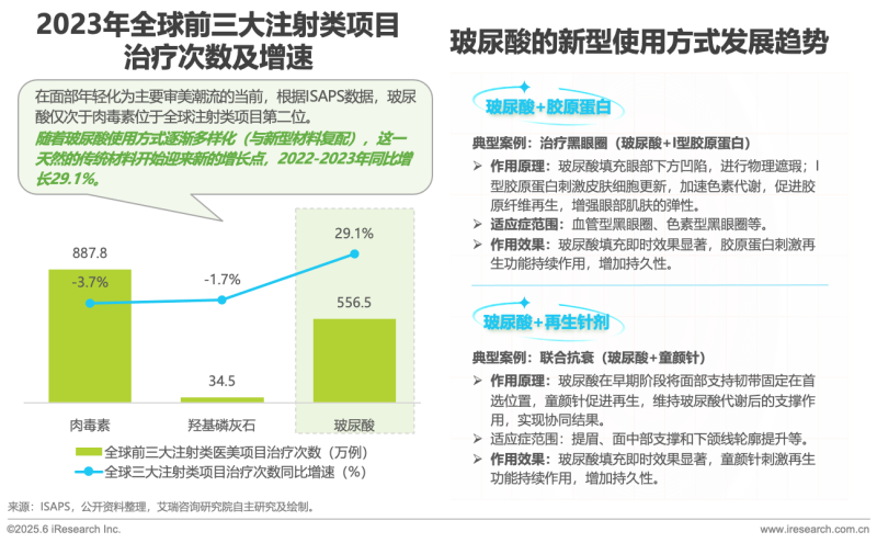 隨著醫(yī)美上游材料的多樣化,玻尿酸作為“頂流”的地位是否會受到?jīng)_擊一直是行業(yè)內(nèi)熱議的話題。根據(jù)ISAPS數(shù)據(jù),2023年全球注射類項目排名中,玻尿酸僅次于肉毒素位居第二。但隨著玻尿酸的復(fù)配方式多樣化、聯(lián)合治療手段越來越成熟,其應(yīng)用邊界被不斷拓寬,2022-2023年增速遠(yuǎn)超肉毒素達(dá)29.1%,似乎迎來了它的“第二增長曲線”。