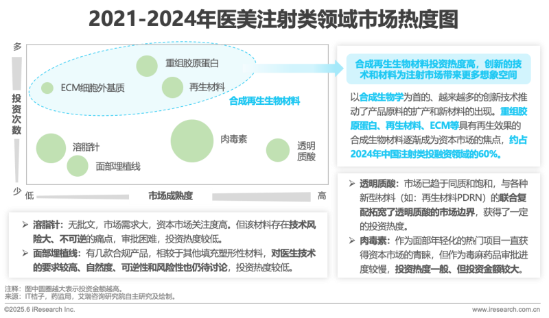 技術(shù)的進(jìn)步推動著上游原料的擴產(chǎn)和材料的多樣化、安全化和同源化,ECM等各種新型材料不斷出現(xiàn),以重組膠原蛋白、再生材料等為首的合成再生生物材料成為醫(yī)美機構(gòu)投資重點。根據(jù)IT桔子數(shù)據(jù),2024年包括泰美瑞、圣至潤和等在內(nèi)的再生生物材料領(lǐng)域的企業(yè)紛紛融資,投資事件約占總注射類材料投資的60%。按照審批情況來看,根據(jù)藥監(jiān)局不完全統(tǒng)計,截止到2024年11月一共有15款針劑通過審批,以玻尿酸類為主,還有幾款聚左旋乳酸、聚己內(nèi)酯和肉毒素類產(chǎn)品。雖然玻尿酸領(lǐng)域近年來投資熱度一般,但其仍為注射類市場的“老字號產(chǎn)品”和“熱門賽道”,與各種新型材料的聯(lián)合復(fù)配也將進(jìn)一步豐富產(chǎn)品矩陣,拓寬注射類市場邊界。