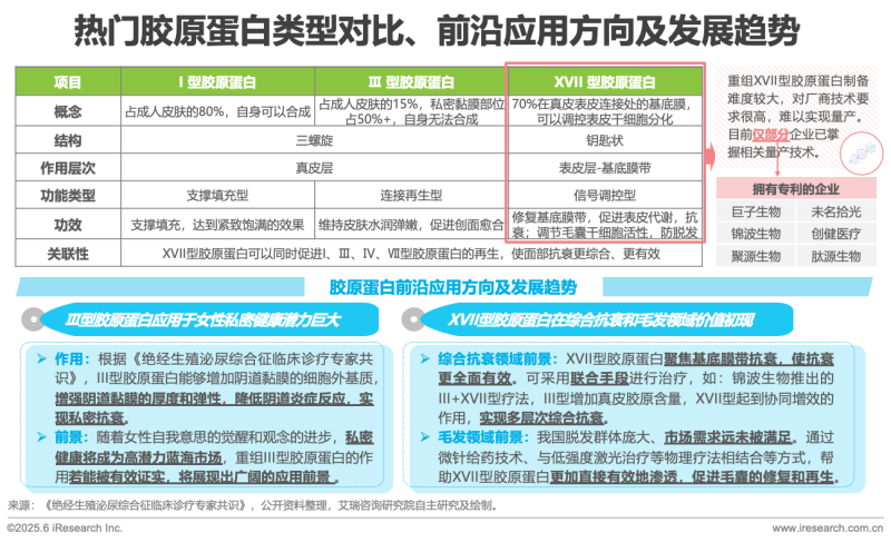 膠原蛋白按照結(jié)構(gòu)和功能可以劃分為28種類型(包括I、Ⅱ、Ⅲ、Ⅳ、Ⅴ、Ⅵ、Ⅹ、XVII…),每種類型的膠原蛋白在人體中扮演著不同的角色。近年來,醫(yī)美行業(yè)應(yīng)用最為廣泛的是I型和Ⅲ型膠原蛋白,起到面部支撐填充及皮膚水潤彈嫩的效果,是抗衰界的潮流產(chǎn)品。隨著對這兩種膠原蛋白適應(yīng)癥的不斷開拓、專業(yè)玩家技術(shù)的成熟及下游消費者需求的進(jìn)階,以XVII型為代表的更多類型的膠原蛋白及其多元功效被不斷發(fā)掘,終端應(yīng)用場景不斷拓展,產(chǎn)品矩陣日漸豐富。