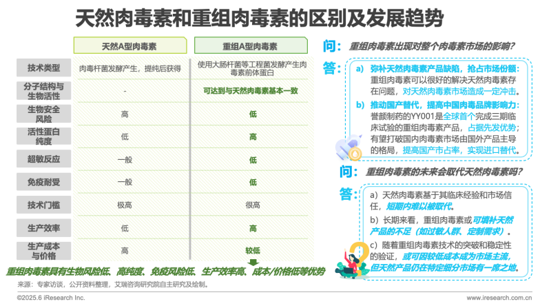 天然肉毒素是從肉毒桿菌培養(yǎng)液中提取的神經(jīng)毒素,含有毒素蛋白及輔助蛋白,臨床應(yīng)用歷史悠久,但可能存在批次差異和雜質(zhì)風(fēng)險。重組肉毒素通過基因工程生產(chǎn),僅含純化毒素蛋白,純度高、穩(wěn)定性強,并可定制化調(diào)整效力或持久性。未來,重組肉毒素有望憑借安全性和可設(shè)計性逐步滲透醫(yī)美市場,但短期內(nèi)天然產(chǎn)品仍占主導(dǎo)。長期來看,兩者可能共存——重組產(chǎn)品側(cè)重高純度、個性化需求,而天然產(chǎn)品依賴品牌信任和成熟應(yīng)用。技術(shù)進(jìn)步和成本優(yōu)化將是重組肉毒素能否顛覆市場的關(guān)鍵。