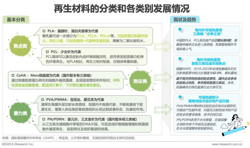 醫(yī)美再生注射類產(chǎn)品通常以微球的形式存在,通過刺激人體自身膠原蛋白的再生,起到填充凹陷、緊致肌膚、美容塑型的作用。醫(yī)美再生材料種類較多,近兩年市場焦點基本集中在聚乳酸(PLA)和聚己內(nèi)酯(PCL)兩大類別,以童顏針、少女針為代表的一系列再生針劑賦予醫(yī)美市場更豐富的品類和更高的增速,也成為各大廠商進(jìn)軍再生領(lǐng)域的“必爭之地”。其次,羥基磷灰石(CaHA)作為人體中天然存在的一種材料廣泛用于骨修復(fù),它較硬的支撐性或可推動其未來在隆鼻、墊下巴等填充領(lǐng)域獲得較大市場份額。