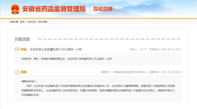 根據(jù)安徽省藥監(jiān)局的答復(fù),企業(yè)負(fù)責(zé)人和質(zhì)量負(fù)責(zé)人均為醫(yī)療器械經(jīng)營企業(yè)質(zhì)量安全關(guān)鍵崗位人員,企業(yè)負(fù)責(zé)人為最高管理者,質(zhì)量負(fù)責(zé)人為高層管理人員或者質(zhì)量管理機(jī)構(gòu)負(fù)責(zé)人。企業(yè)質(zhì)量負(fù)責(zé)人應(yīng)當(dāng)在職在崗,并履行崗位職責(zé)。故醫(yī)療器械經(jīng)營企業(yè)質(zhì)量負(fù)責(zé)人不能兼任企業(yè)負(fù)責(zé)人。