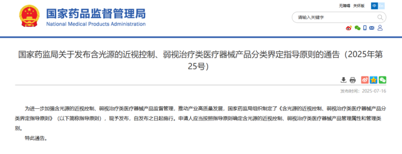 7月16日,國家藥監(jiān)局發(fā)布《含光源的近視控制、弱視治療類醫(yī)療器械產(chǎn)品分類界定指導(dǎo)原則》(以下簡稱《指導(dǎo)原則),并宣布自發(fā)布之日起施行。