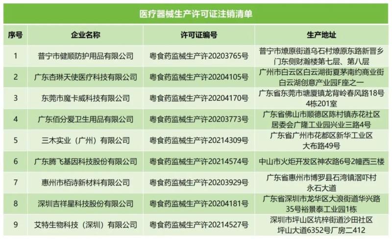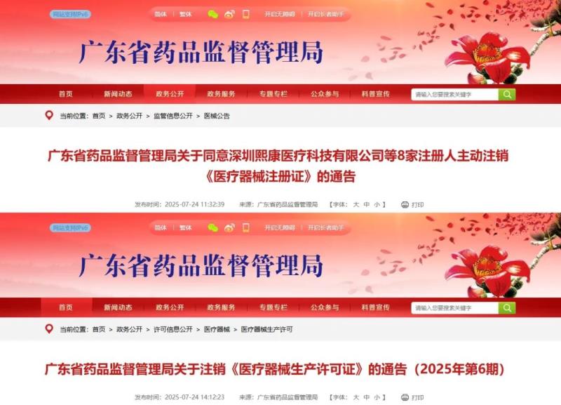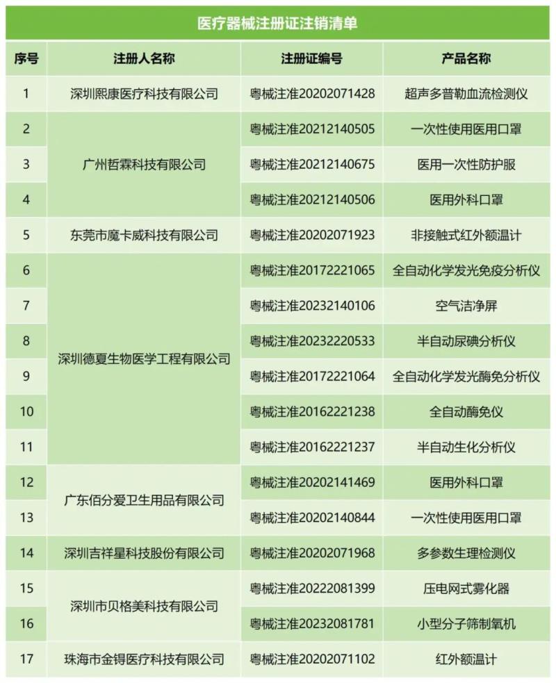 近日,廣東省藥監(jiān)局發(fā)布兩則注銷通告,通告顯示,根據企業(yè)申請,該局已注銷深圳熙康醫(yī)療科技有限公司、深圳德夏生物醫(yī)學工程有限公司等8家注冊人持有的17張《醫(yī)療器械注冊證》,同時注銷了廣東佰分愛衛(wèi)生用品有限公司、深圳吉祥星科技股份有限公司等9家企業(yè)的《醫(yī)療器械生產許可證》,具體明細如下: