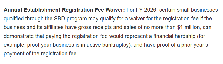 不過(guò)在費(fèi)用普漲的同時(shí),F(xiàn)DA也釋放出了給企業(yè)減負(fù)的信號(hào):2026財(cái)年,FDA給小企業(yè)提供了 免年費(fèi) 的選項(xiàng),前提是這些企業(yè)證明支付費(fèi)用會(huì)給他們帶來(lái)經(jīng)濟(jì)困難,具體條件如下: