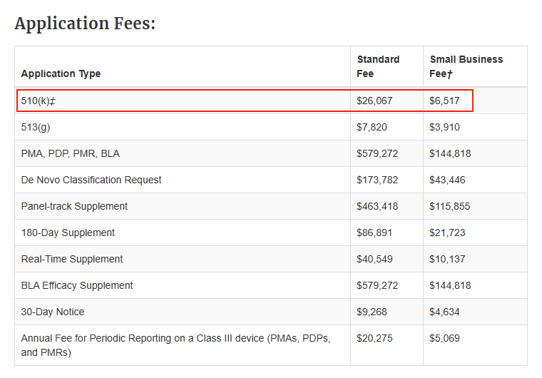 具體來(lái)說(shuō),企業(yè)注冊(cè)年費(fèi)漲至$11423,相比2025財(cái)年的$9280上漲了$2143,漲幅23.1%;相比而言,510(k)申請(qǐng)費(fèi)的漲幅則要稍小一些:其中510(k)申請(qǐng)標(biāo)準(zhǔn)收費(fèi)漲至$26067,小企業(yè)的510(k)申請(qǐng)費(fèi)則為6517美元,漲幅均為7.1%。