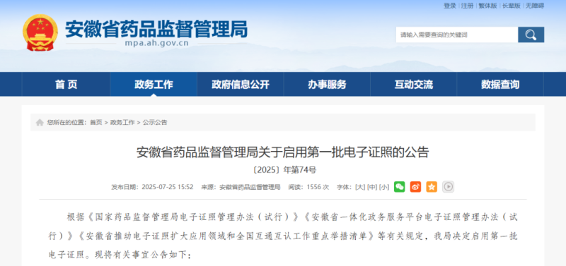 電子證照同步在安徽省藥品監(jiān)督管理局門戶網(wǎng)站電子證照公示欄目(https://mpa.ah.gov.cn)公示。該公告同時(shí)提到,電子證照啟用前該局已頒發(fā)的相關(guān)紙質(zhì)證書(含正本、副本、附頁(yè)和變更記錄頁(yè)),在有效期內(nèi)繼續(xù)使用。