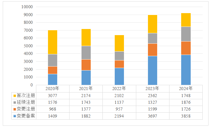 按受理注冊(cè)類(lèi)型區(qū)分,2024年受理首次注冊(cè)1748項(xiàng),同比降低26.0%;受理延續(xù)注冊(cè)1876項(xiàng),同比增加41.4%;受理變更注冊(cè)1726項(xiàng),同比增加7.9%;受理變更備案3858項(xiàng),同比增加4.4%。
