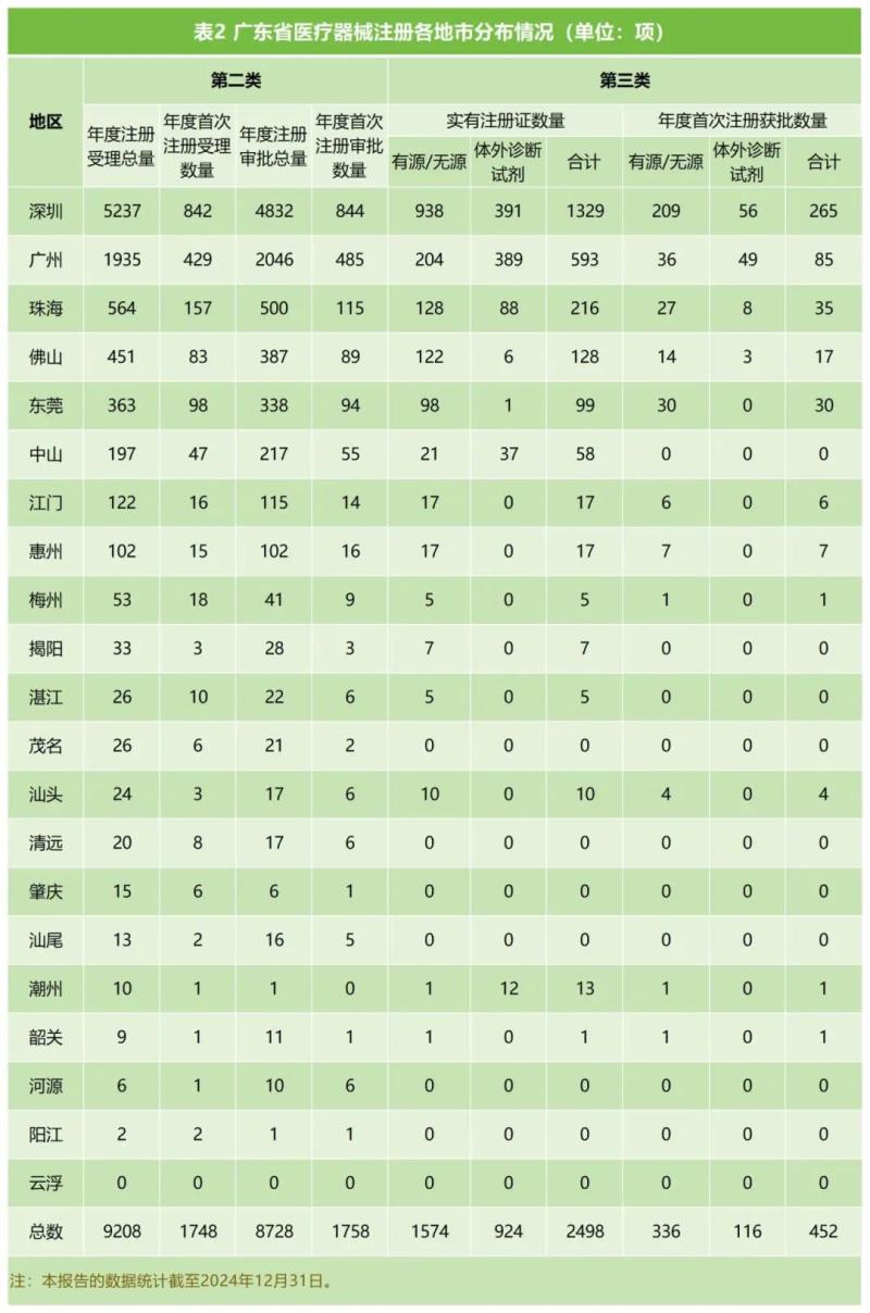 2024年,廣東省各地市第二類(lèi)醫(yī)療器械注冊(cè)受理和審批分布情況、第二類(lèi)醫(yī)療器械首次注冊(cè)受理和審批分布情況、第三類(lèi)醫(yī)療器械首次注冊(cè)獲批情況及截至2024年底各地市實(shí)有第三類(lèi)醫(yī)療器械注冊(cè)證情況見(jiàn)表2。