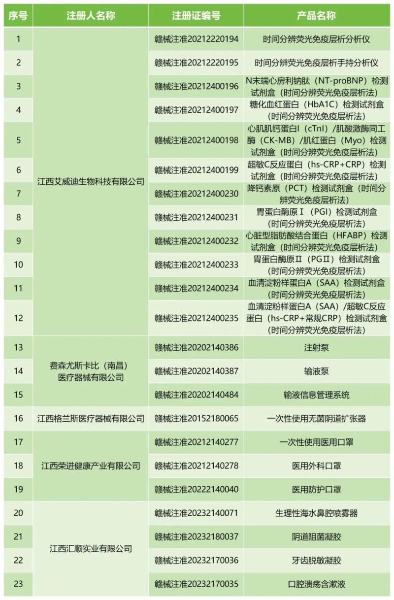 近日,江西省藥監(jiān)局發(fā)布一則醫(yī)療器械注冊證注銷公告,公告顯示,該局已依法注銷江西艾威迪生物科技有限公司費(fèi)森尤斯卡比(南昌)醫(yī)療器械有限公司、江西榮進(jìn)健康產(chǎn)業(yè)有限公司5家企業(yè)共計(jì)23個(gè)產(chǎn)品的醫(yī)療器械注冊證,包括時(shí)間分辨熒光免疫層析分析儀、輸液泵、注射泵、牙齒脫敏凝膠等產(chǎn)品,具體明細(xì)如下: