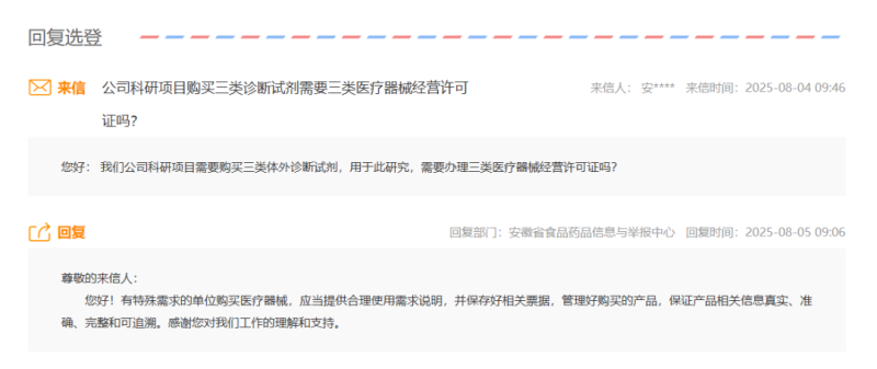 根據(jù)安徽省藥監(jiān)局的答復,有特殊需求的單位購買醫(yī)療器械,應當提供合理使用需求說明,并保存好相關票據(jù),管理好購買的產(chǎn)品,保證產(chǎn)品相關信息真實、準確、完整和可追溯。