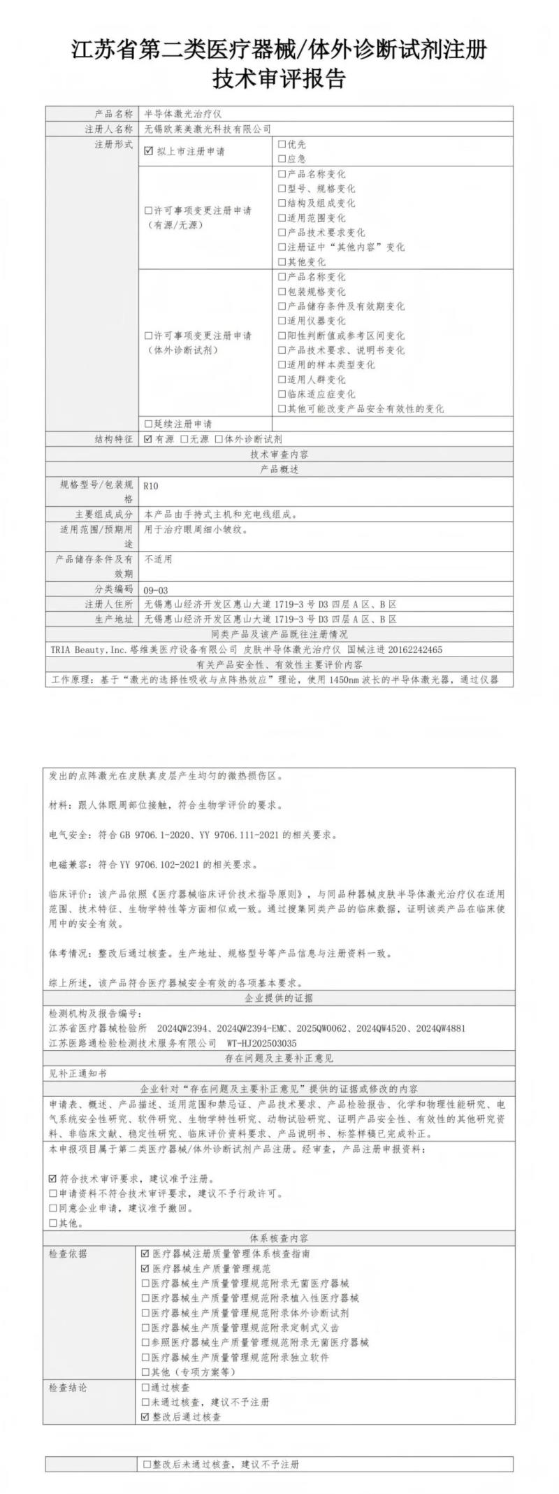 8月12日,江蘇省藥監(jiān)局公布了2025年7月批準(zhǔn)注冊(cè)的神經(jīng)肌肉電刺激儀、醫(yī)用分子篩制氧機(jī)、半導(dǎo)體激光治療儀、紅藍(lán)光治療儀、全自動(dòng)沖擊波治療儀、醫(yī)用絲素蛋白凝膠敷料、超聲波治療儀、醫(yī)用重組膠原蛋白液體敷料、醫(yī)用壓縮式霧化器、一次性醫(yī)用激光光纖136個(gè)醫(yī)療器械產(chǎn)品目錄,同時(shí)隨附了所有產(chǎn)品的技術(shù)審評(píng)報(bào)告,我們將其中“半導(dǎo)體激光治療儀預(yù)期用途:用于治療眼周細(xì)小皺紋的技術(shù)審評(píng)報(bào)告以圖片形式轉(zhuǎn)載如下: