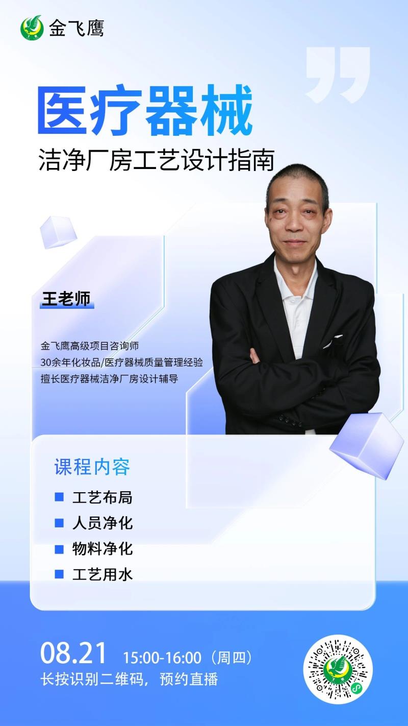 8月21日下午3點(diǎn),金飛鷹高級(jí)項(xiàng)目咨詢師,有著30余年化妝品/醫(yī)療器械質(zhì)量管理經(jīng)驗(yàn),尤為擅長(zhǎng)醫(yī)療器械潔凈廠房設(shè)計(jì)輔導(dǎo)的王老師給大家?guī)怼?/span>醫(yī)療器械潔凈廠房工藝設(shè)計(jì)指南》,無論您是正在規(guī)劃新的生產(chǎn)場(chǎng)地,還是希望提升現(xiàn)有廠房的運(yùn)行效率,都能從課程中獲得專業(yè)指導(dǎo),感興趣的朋友記得提前預(yù)約!