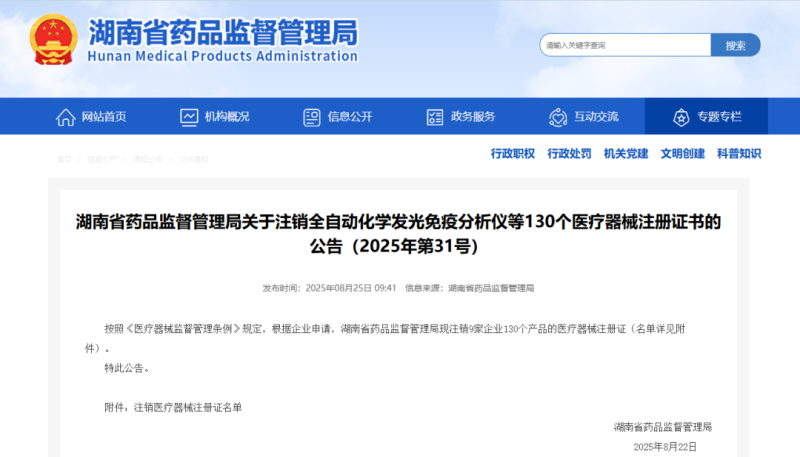 湖南藥監(jiān)局:以下9家企業(yè)的130張醫(yī)療器械注冊(cè)證已被注銷!