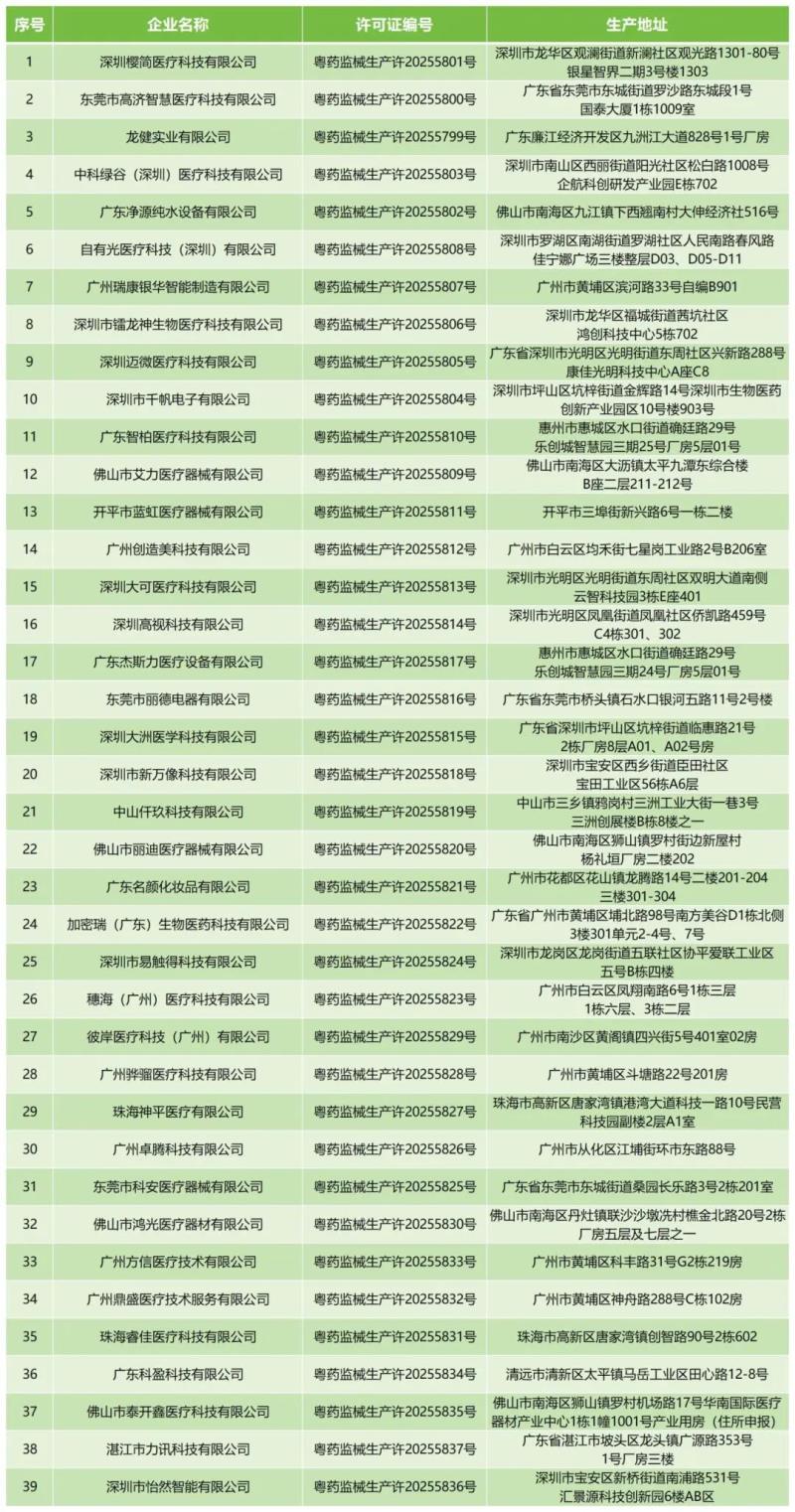近日,廣東省藥監(jiān)局公布了《2025年7月醫(yī)療器械生產(chǎn)許可證核發(fā)清單》,據(jù)該公開數(shù)據(jù)顯示,2025年7月,中科綠谷(深圳)醫(yī)療科技有限公司、自有光醫(yī)療科技(深圳)有限公司、東莞市麗德電器有限公司、彼岸醫(yī)療科技(廣州)有限公司等共計(jì)39家企業(yè)新拿到了醫(yī)療器械生產(chǎn)許可證,具體明細(xì)如下:
