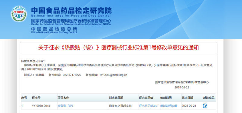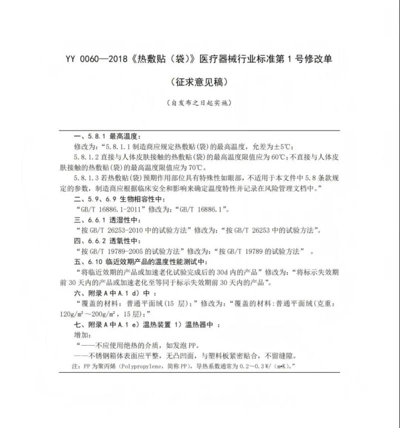近日,國家藥監(jiān)局醫(yī)療器械標管中心發(fā)布YY 0060-2018《熱敷貼(袋)》醫(yī)療器械行業(yè)標準第1號修改單,并向社會公開征求意見。
