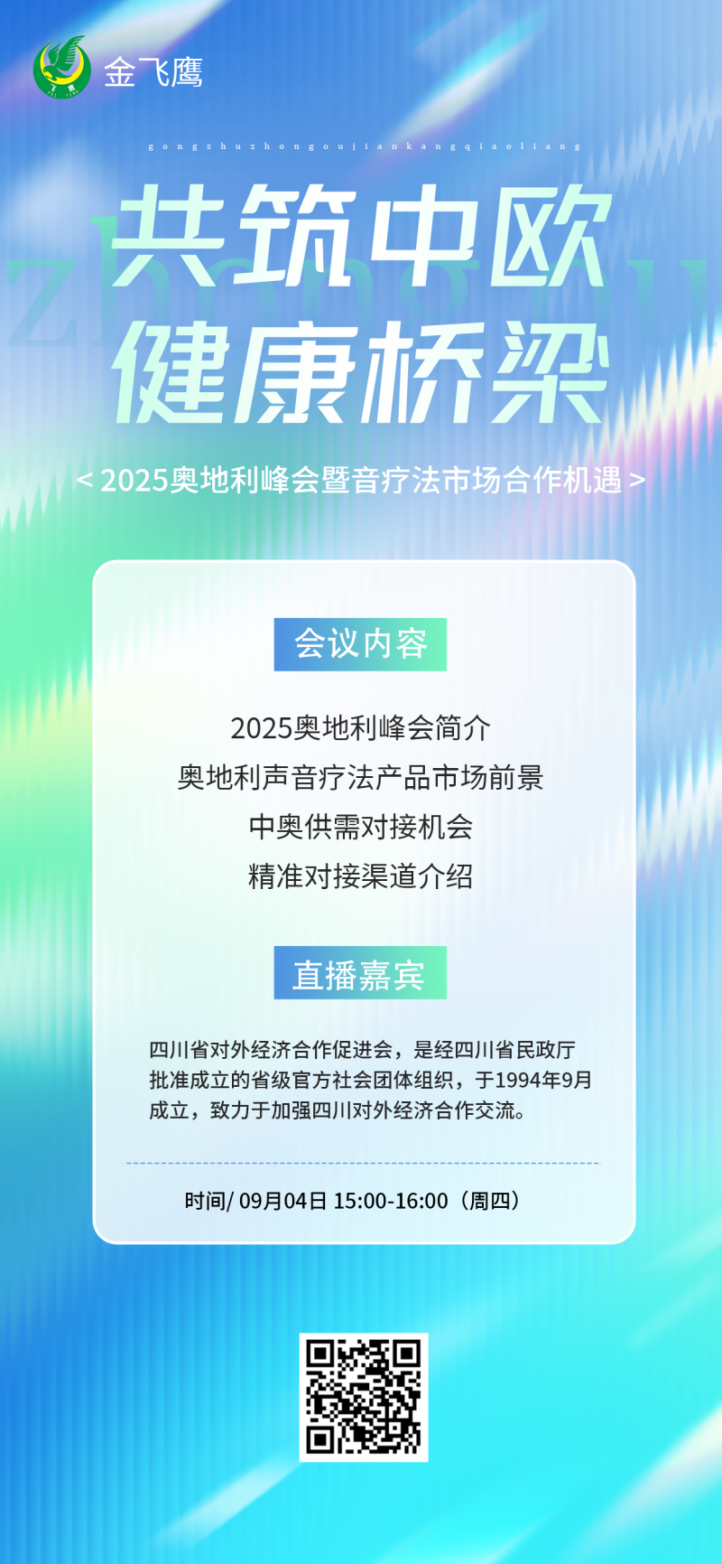在此背景下,9月4日下午3點,我們特別聯(lián)合四川省對外經(jīng)濟合作促進會,給大家?guī)?/span>第十一屆“全球經(jīng)濟發(fā)展論壇·奧地利峰會”暨音療法市場合作機遇的直播,為您解鎖奧地利市場的財富密碼!本期直播將從奧地利音療法產(chǎn)品市場前景、中奧供需對接機會及渠道等方面進行分享,與各位共拓奧地利的掘金版圖,感興趣的朋友記得提前預約!