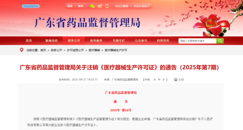 廣東藥監(jiān)局:以下20張醫(yī)療器械生產(chǎn)許可證已被注銷!