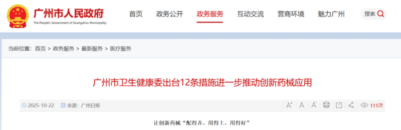 日前,廣州市衛(wèi)生健康委印發(fā)《廣州市衛(wèi)生健康委員會進(jìn)一步推動創(chuàng)新藥械應(yīng)用十二條措施》(以下簡稱《措施》),從暢通創(chuàng)新藥械入院全流程、加強(qiáng)創(chuàng)新藥械臨床推廣應(yīng)用、優(yōu)化創(chuàng)新藥械發(fā)展生態(tài)三方面推出措施,以提升疾病診療水平與醫(yī)療服務(wù)能力,保障人民健康,讓創(chuàng)新藥械在廣州“配得齊、用得上、用得好”。